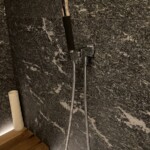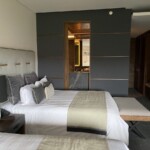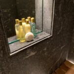 My room was lovely but as a whole didn’t appear to be as large as the rooms I had seen on social media. The bathroom, however, had more than enough allotted space with a very large rainfall shower, counter area with double sinks, toilet area, and more mirrors than I’ve ever seen in a bathroom. The bathroom can be totally closed off to the bedroom area; there are two “exposure” points if you don’t want to entirely close it off–the sliding entry door and the “window” panel.
