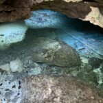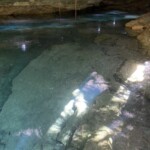 Cenote #3 (Uchben-Ha), was an open cenote teeming with underwater life so snorkelers would have a field day here. There was a hammock on an upper level by the cenote entrance and there were several places from which to jump into the water. Try the two little “islands” first, if that is not challenging enough then you’d have to go back up to the top of the cenote by the hammock area and walk around to the other side to find a suitable jumping platform. Use caution if you decide to do so since this is one of the more shallow cenotes with depths from only 3 to 13 feet at various points. Also, be aware that pieces of the cenote ceiling which collapsed ages ago and which now reside on the bottom can be slippery, so watch your step as you make your way to the open water.
