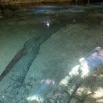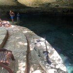 Cenote #3 (Uchben-Ha), was an open cenote teeming with underwater life so snorkelers would have a field day here. There was a hammock on an upper level by the cenote entrance and there were several places from which to jump into the water. Try the two little “islands” first, if that is not challenging enough then you’d have to go back up to the top of the cenote by the hammock area and walk around to the other side to find a suitable jumping platform. Use caution if you decide to do so since this is one of the more shallow cenotes with depths from only 3 to 13 feet at various points. Also, be aware that pieces of the cenote ceiling which collapsed ages ago and which now reside on the bottom can be slippery, so watch your step as you make your way to the open water.